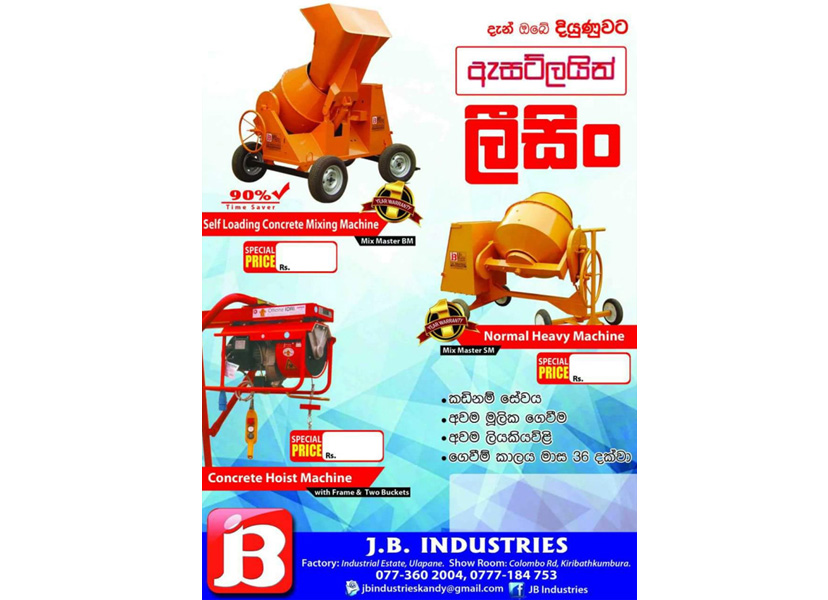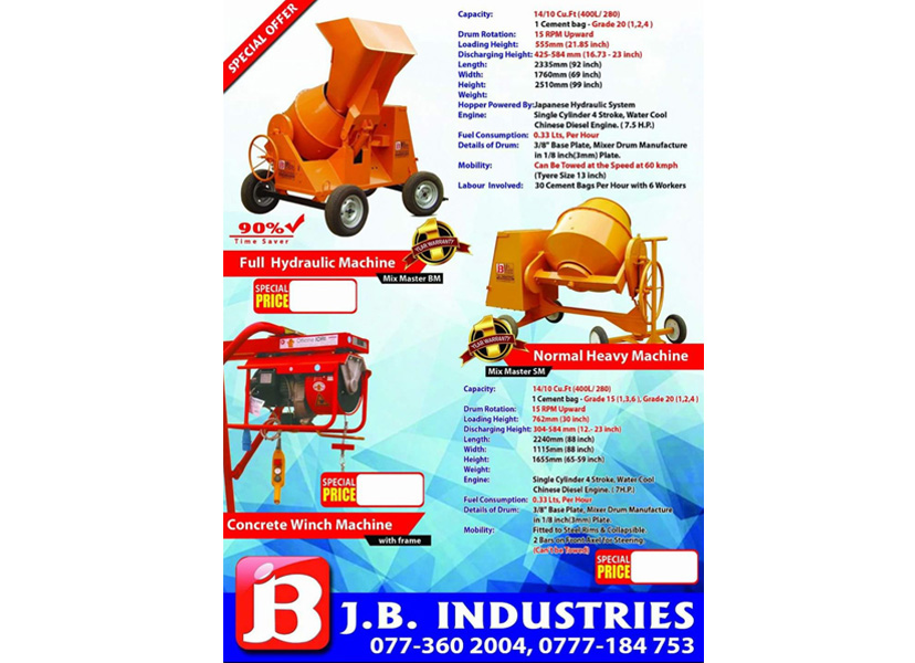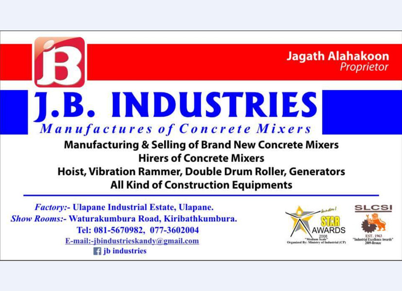 J.B.Industries, was founded on year 1998 by entrepreneur Mr.J.B.Alahakoon in the hill capital of sri lanka with the aim of providing the best concrete mixing machinery to our construction industry. J.B.Industry was awards winning company.